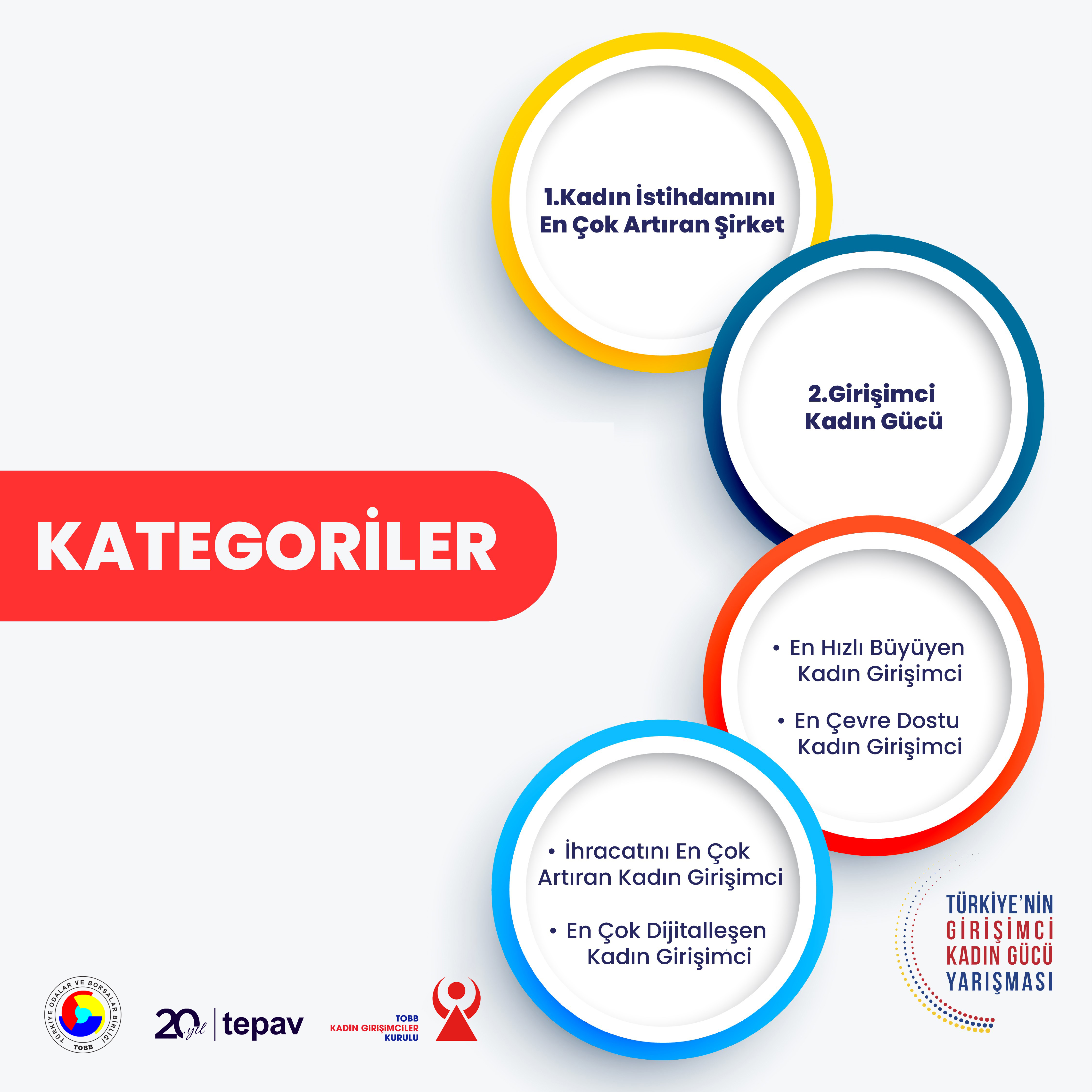 Türkiye’nin Girişimci Kadın Gücü Yarışması, “Kadın İstihdamını En Çok Artıran Şirket” ve “Girişimci Kadın Gücü” olmak üzere iki ayrı kategoriden oluşmaktadır.