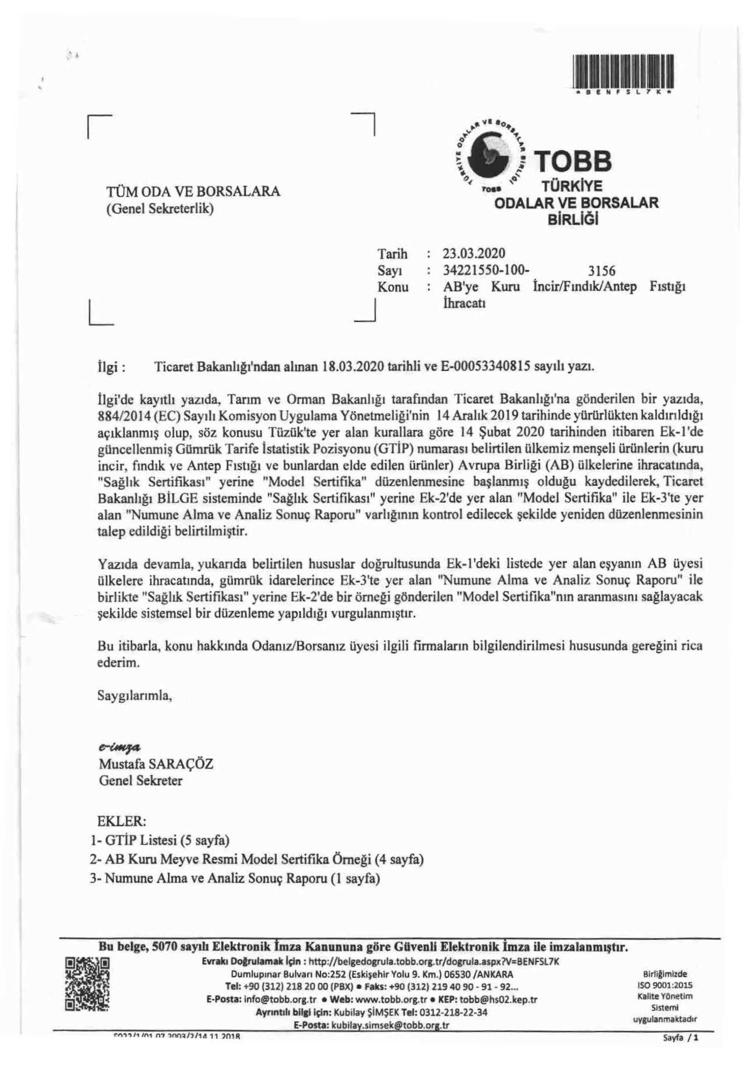 Tarım ve Orman Bakanlığı tarafından Ticaret Bakanlığı’na gönderilen yazıda; 884/2014 (EC) Sayılı Komisyon Uygulama Yönetmeliği kapsamında, EK’te güncellenmiş Gümrük Tarife İstatistik Pozisyonu (GTİP) numaraları belirtilen ülkemiz menşeli ürünlerin (kuru incir, fındık ve Antep fıstığı ile bunlardan elde edilen ürünler) Avrupa Birliği (AB) ülkelerine ihracatında “Sağlık Sertifikası” yerine “Model Sertifikası” düzenlenmesine başlanmış olduğu, Ticaret Bakanlığı BİLGE sisteminde “Sağlık Sertifikası” yerine EK’te yer alan “Model Sertifika” ile EK’te yer alan “Numune Alma ve Analiz Sonuç Raporu” varlığının kontrol edilecek şekilde yeniden düzenleme yapılmasının talep edildiği bildirilmektedir.
