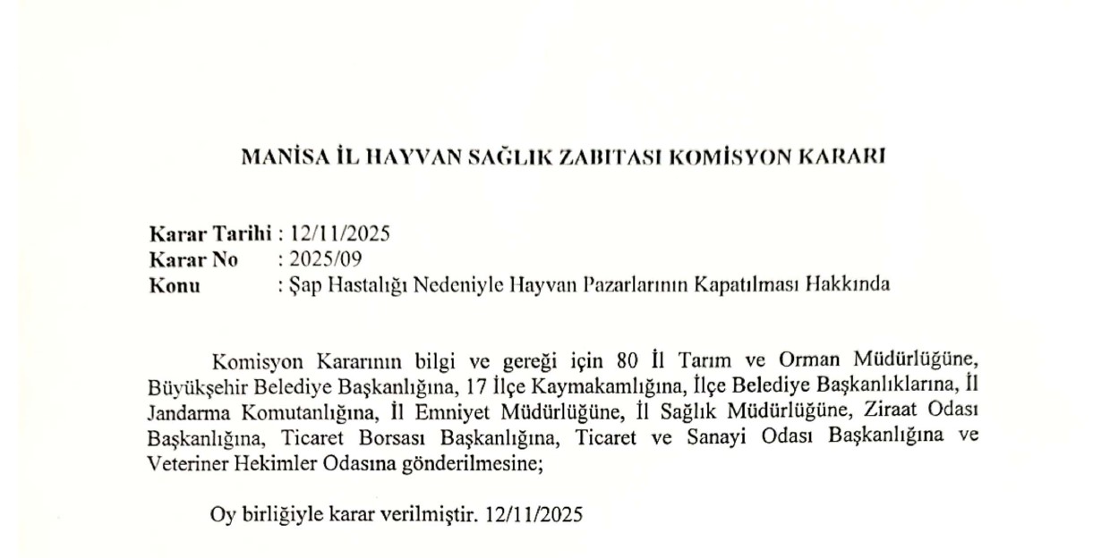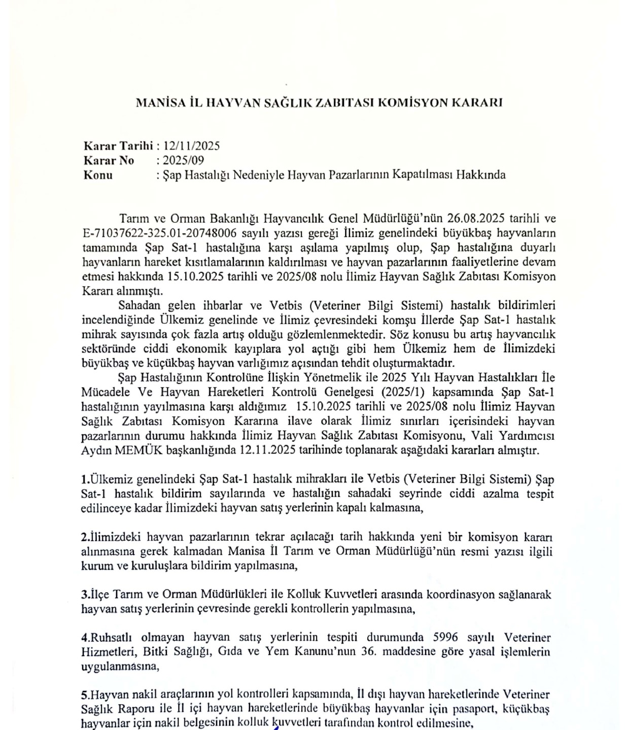 5996 Sayılı Veteriner Hizmetleri, Bitki Sağlığı, Gıda ve Yem Kanunu ile bu kanun kapsamında çıkarılan 2025/01 sayılı Hayvan Hastalıkları ile Mücadele ve Hayvan Hareketleri Kontrolü Genelgesi çerçevesince İlimiz sınırları içerisindeki hayvan satış yerlerinin kapatılması hakkında alınan 2025/09 no'lu Manisa İli Hayvan Sağlık Zabıtası Komisyon Kararı aşağıda belirtilmiştir.