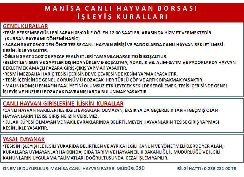 Yurt İçinde Canlı Hayvan ve Hayvansal Ürünlerin Nakilleri Hakkında Yönetmelik’te Belirtilen Şartlar, Gıda Tarım ve Hayvancılık Bakanlığı ile Gıda Tarım ve Hayvancılık İl Müdürlüğü’nün İlgili Talimatları Gereği Manisa Canlı Hayvan Pazarı'nın işleyi yeniden düzenlenmiş ve ilgililerin dikkatine ilanen sunulmuştur. İşleyiş şartlarına gerekli uyumun sağlanması Manisa Canlı Hayvan Pazarı Sorumlu Veteriner Hekimliğince rica olunur.