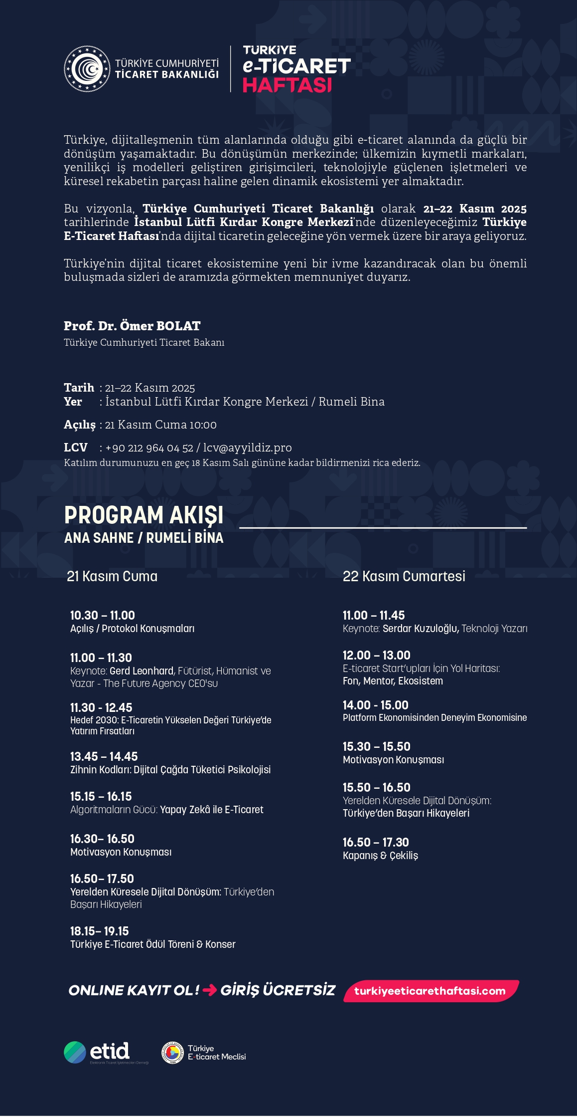 Türkiye'de dijitalleşmenin hızla gelişen boyutları çerçevesinde e-ticaret ekosistemi; girişimciler, işletmeler, teknoloji sağlayıcıları ve kamu otoritelerini bir araya getiren stratejik bir alan olarak önemini artırmaktadır. Bu kapsamda, Türkiye Cumhuriyeti Ticaret Bakanlığı tarafından 21-22 Kasım 2025 tarihlerinde İstanbul Lütfi Kırdar Kongre Merkezi Rumeli Binası'nda düzenlenecek olan "Türkiye E-ticaret Haftası" programı gerçekleştirilecektir.